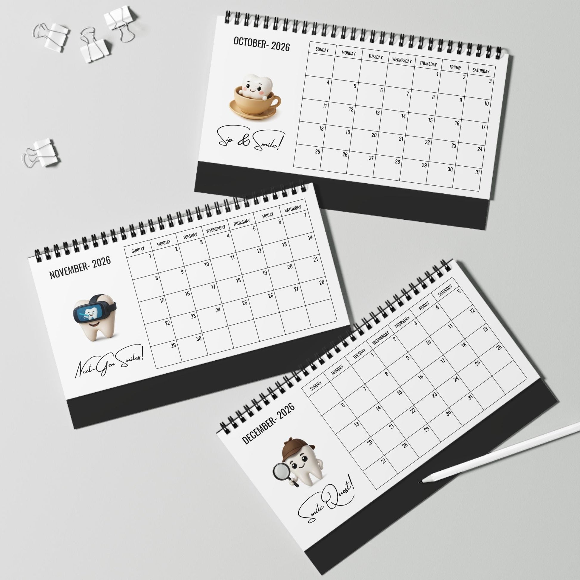 Bring joy to every month with this adorable 2026 dental desk calendar, featuring 12 unique cute tooth characters, each paired with a short smile-themed quote to brighten your day.